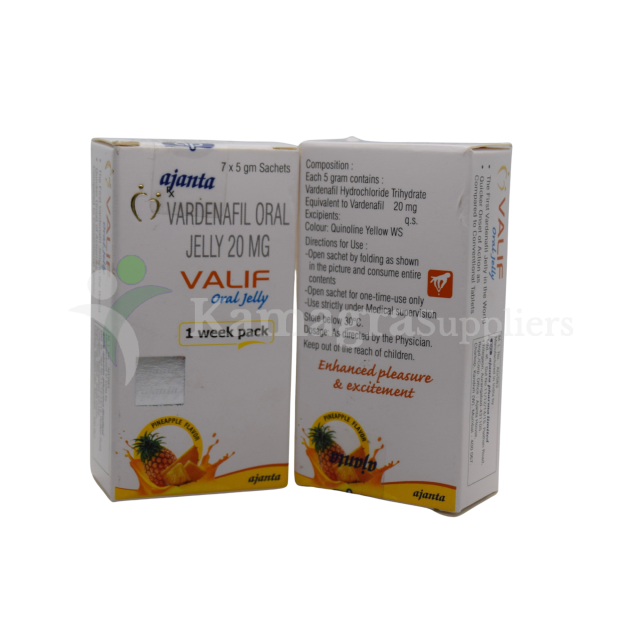 Valif 20 Oral Jelly is a fast-absorbing and powerful erectile dysfunction (ED) treatment containing Vardenafil 20mg, a clinically proven PDE5 inhibitor known for quick action and high success rate.Unlike tablets that take longer to dissolve, Valif Oral Jelly melts instantly in the mouth or can be swallowed directly—delivering rapid absorption and faster onset of erection. Valif 20 Oral Jelly is ideal for men who want: * A fast-acting ED solution * A flavored, smooth, easy-to-consume jelly * No need to swallow hard tablets * Better performance and longer-lasting results Highly demanded across local markets and international export regions, Valif 20 Oral Jelly is a premium, effective, and convenient alternative of branded Vardenafil tablets.